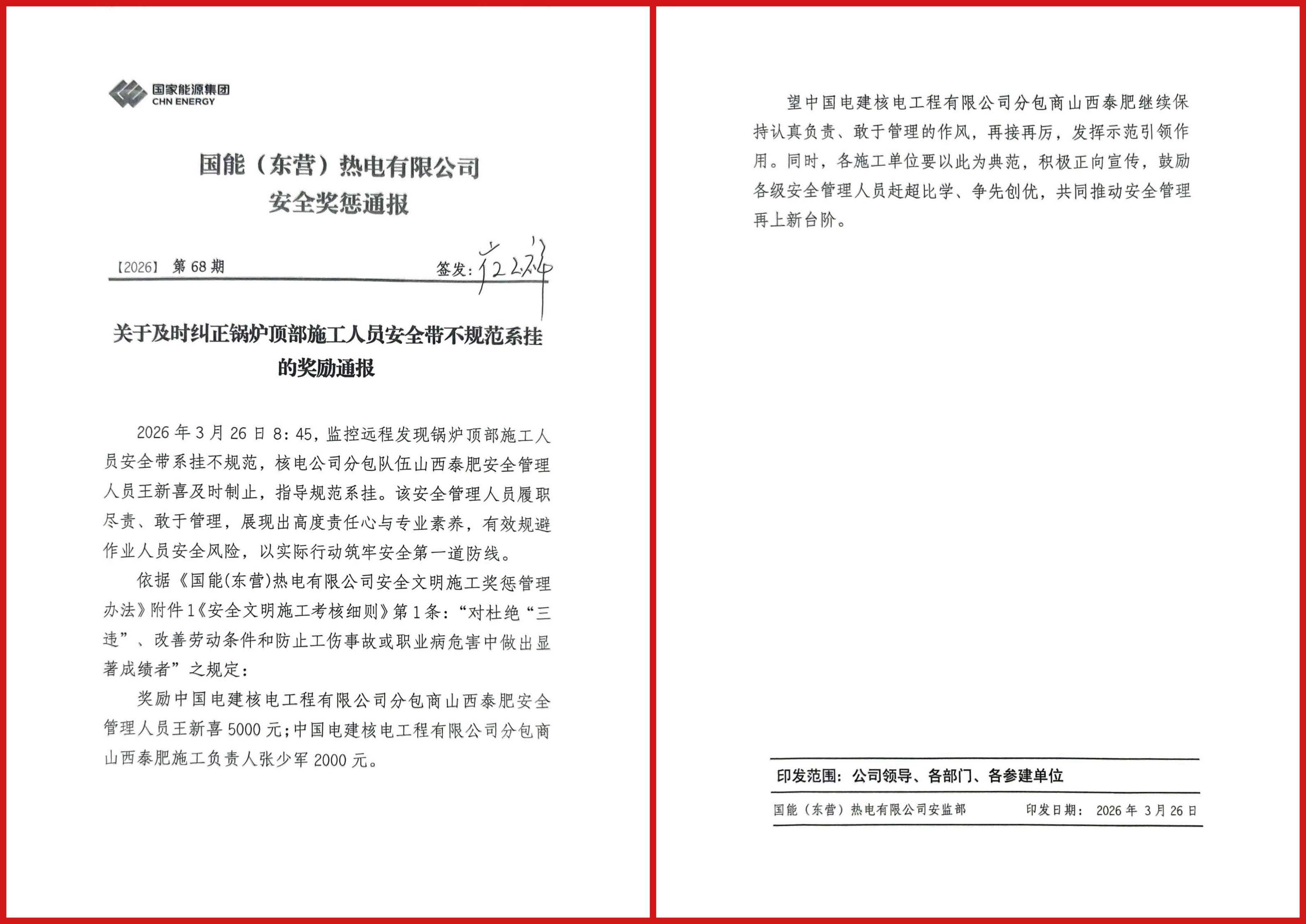 安全是發展的底線,更是攻堅的保障。項目始終堅持 “安全第一、預防為主”,將安全管控貫穿施工全程。2026 年 3 月 26 日 8:45,山西泰肥安全管理人員王新喜發現鍋爐頂部施工人員安全帶系掛不規范,第一時間果斷制止并指導規范操作,以高度的責任心和專業素養,及時規避安全風險,筑牢安全生產第一道防線。依據《國能 (東營) 熱電有限公司安全文明施工獎懲管理辦法》相關規定,為表彰先 進、樹立標桿,特獎勵履職盡責的王新喜 5000 元,獎勵其施工負責人張少軍 2000 元。這份榮譽,是對安全管理成效的肯定,更是對全體人員的激勵。